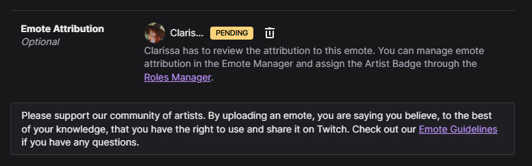 • You may not claim credit for my work, and credit must be given to me where applicable (e.g. Twitch emotes must be credited to me in either a panel, and/or through Twitch's emote attribution pictured below).